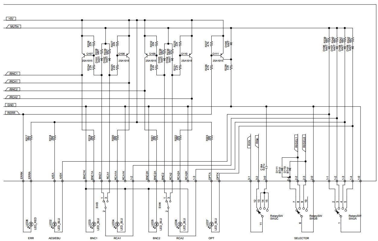 入力のAES/EBU、COAX1、COAX2、OPTの4ポジションは3回路4接点のロータリースイッチで切り替えます。COAX1,2に設けたRCAとBNC端子はトルグスイッチで切り替えます。ロータリースイッチ1段目はポジション表示のLEDに使用します。2段目はCS8416の入力切り替え端子をダイオードマトリックスで制御します。ダイオードは順方向降下電圧の小さいショットキーダイオードを使います。3段目は平衡・不平衡の切り替えを行います。ここまでSPDIFの信号が来ますので2芯シールド線を使います。CS8416がエラーした時にMuteしてノイズの発生を抑止します。
