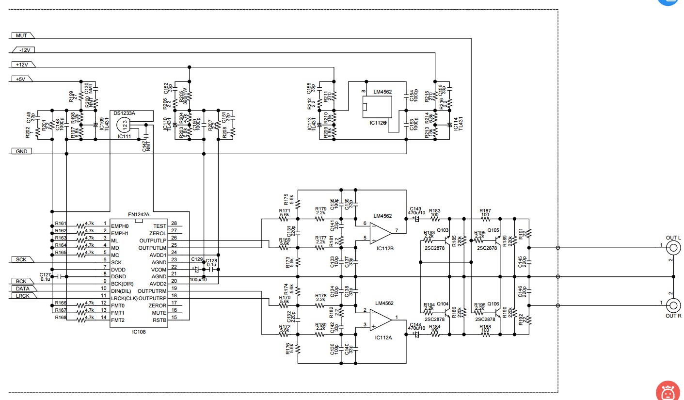 DACはFN1242N、LPFはLM4562を使用します。RESTはCS8416と同じDS1233Aです。FN1242AのDVDとAVDの各々はTL431 Shunt Refulatorで給電します。DVDは+5Vを給電します。LPFにパルスを供給する出力段を含むAVDは形状はパルスでデジタルですが情報はアナログ信号と同じなのでアナログとしてLM4562の元電源±12Vの+12VをShunt Regulatorに供給します。この元電源の使い分けはDACの音質に大きく影響します。LPFは群遅延平坦特性を優先します。電源ON/OFF、入力切り替え、CS8416でエラーが発生した際のノイズを防ぐため2SC2878によるミュートを行います。減衰量を確保するため2段でミュートを行います。