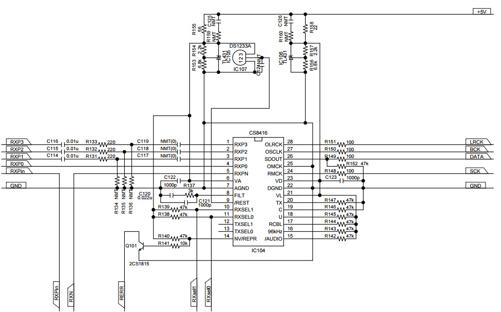 ・DIR:多くの製作記事で使用されているCS8416です。Pin26をプルダウンするとハードウエアモードとなりスイッチ等で制御できます。VA、VD各々にTL431 Shunt Regulatorを用います。RESTはDS1233Aを用います。