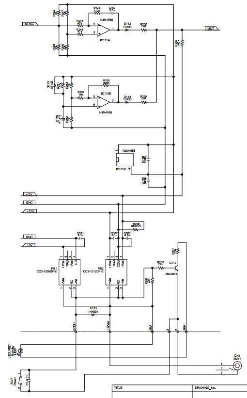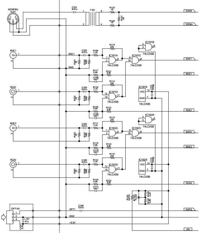・入力端子:COAXはRCA端子が一般的です。スペックを見ると伝送インピーダンス75Ωと指定されています。AVケーブルテクノロジーズの根岸様の記事によるとRCA端子の伝送インピーダンスは23Ωしかなく、75Ωから大きく乖離しています。1.41MHzから12.188MHzまでの高い周波数を扱う際に端子部でのロスが起き音質の阻害要因となります。端子部での不整合を避けるためBNC端子を使えるようにしました。(長年FMチューナーに携わってきた拘りです。)COAX1, 2は各々にRCAとBNC端子を装備し、SWで切り替えられるようにします。高速の74LCX00 NAND gateで切り替えを行います。このステージに一つTL431 Shunt Regulatorを用います。