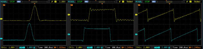 ・フルエンシーDAC:FN1241Aは、フルエンシー関数によるデジタルフィルターが搭載されています。簡単に言うと、過度応答に着目したスローロールオフのデジタルフィルターです。このため20kHzまで平坦な周波数特性は得られませんが、過度応答でプリエコー・エコーの発生が少ないという特長があります。写真上段は通常の周波数特性が平坦なDAC、下段はフルエンシーDACの再生波形です。左から、5kHzのSinX/X、1kHz -3dB方形波、1kHz -3dB鋸歯状波です。