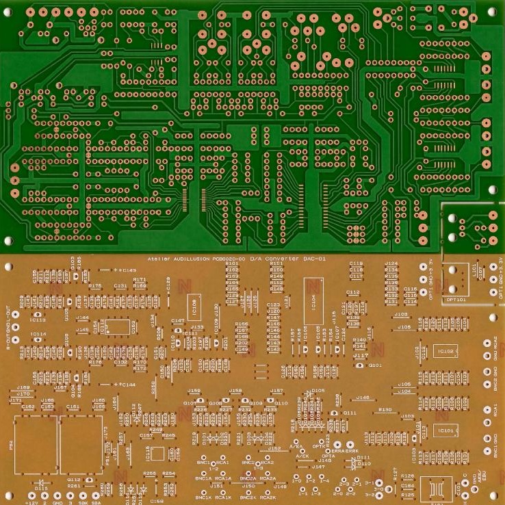 最近はFR4と呼ばれるガラスエポキシ材が主流で、両面基板が標準になっています。しかし、音質面では昔ながらの紙フェノール材が優れており、安易に両面基板でプレーングランドとすると一見良さそうですが意図しない電流の流れができ音質を阻害しますので、あえて片面基板で設計し紙フェーノール材FR1を指定しています。