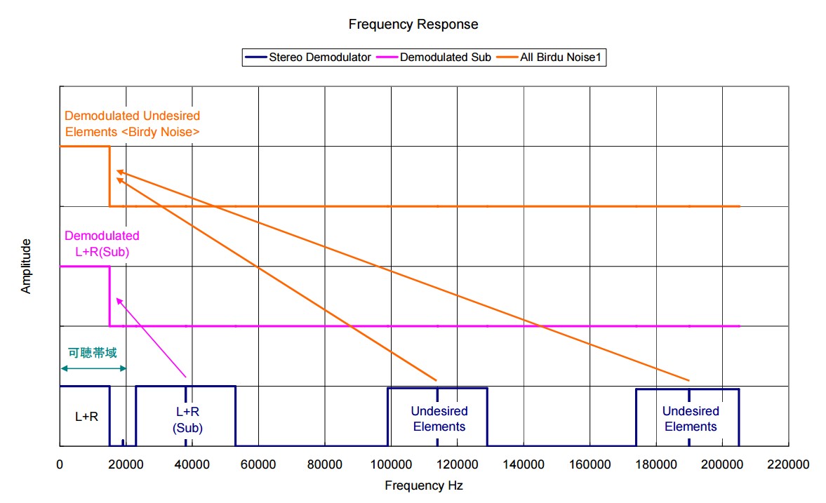 L/Rに分離するために用いる方形波は、奇数時の高調波を持ちます。すなわち38kHz, 114kHz, 190kHz/・・・・と無限に周波数成分が存在します。200kHz以上の成分はIFフィルターが除去しますのであまり問題にはなりませんが、114kHz+/-15kHzや190kHz+/-15kHzに存在する妨害成分は可聴帯域に変換されグジュグジュとかキュルキュルといった雑音になります。バーディー(鳥のさえずり)ノイズと呼ばれており、発生を示します。
