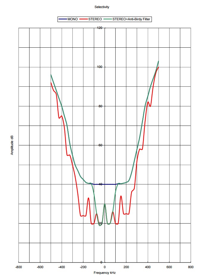 MONOとSTEREO及びSTEREOでアンチバーデーフィルターを用いた場合の選択度を示します。STEREO時の選択度はMONOより格段に悪化します。妨害信号が53kHzまで離れていく際に発生するビート成分は、ステレオ復調の帯域内なので防ぎようがありませんし、実際このようなビートを発生することはありません。しかし、三次高調波114kHz近傍は、RF相互変調によるスプリアスが発生しビートとなることがあります。190kHz近傍は遠距離受信の際、ローカル局が存在したりすることがあります。アンチバーデーフィルターを用いるとSTEREOの帯域内は変わりませんが、53kHz以上妨害信号が遠ざかると、MONOと同じ選択度が確保できます。