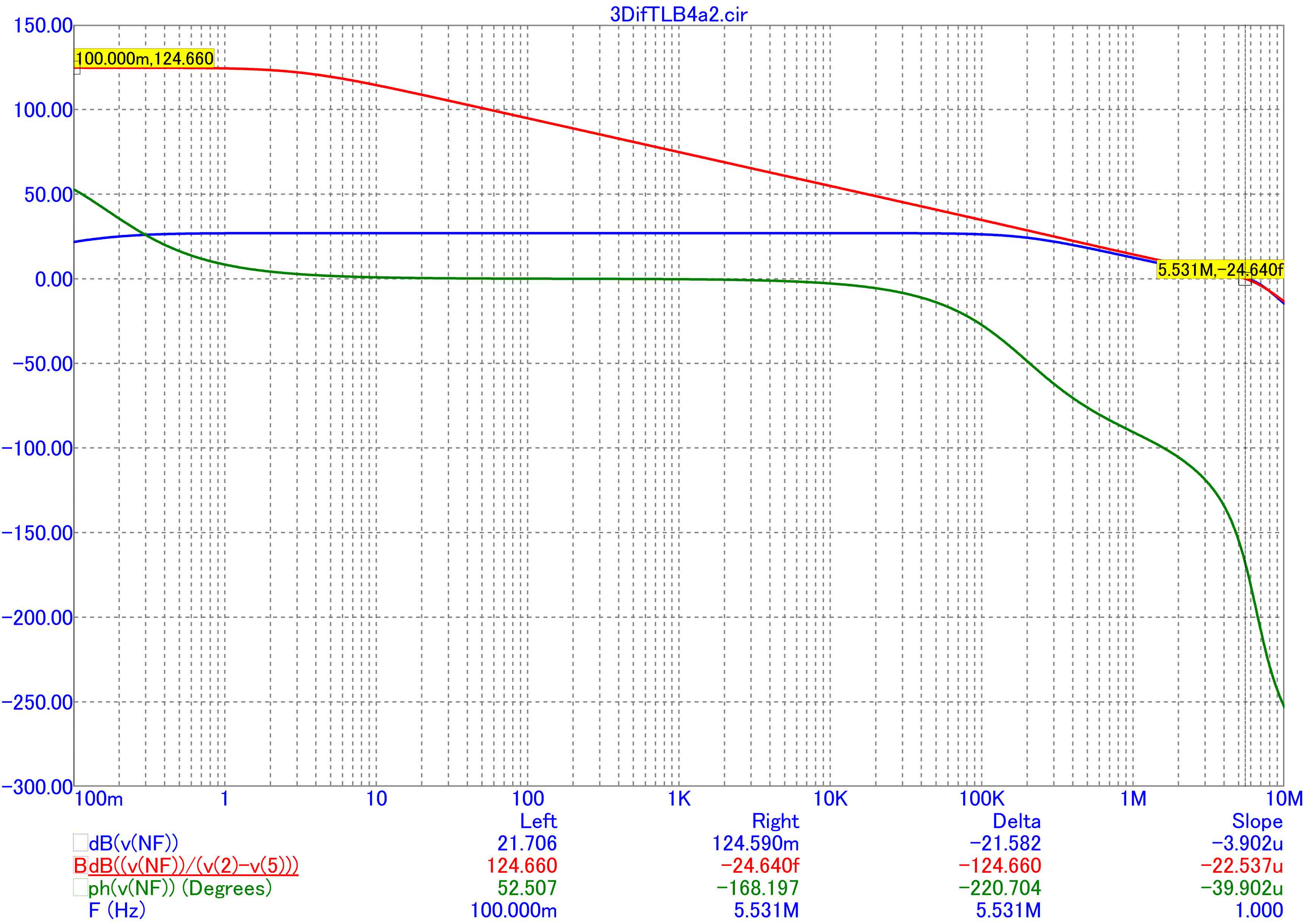 オープンループゲインは124dBです。一般的なオペアンプ同等です。流石にJ-FET差動+ADA4700-1にはおよびませんが、必要十分と判断します。位相余裕は11度で、安定です。